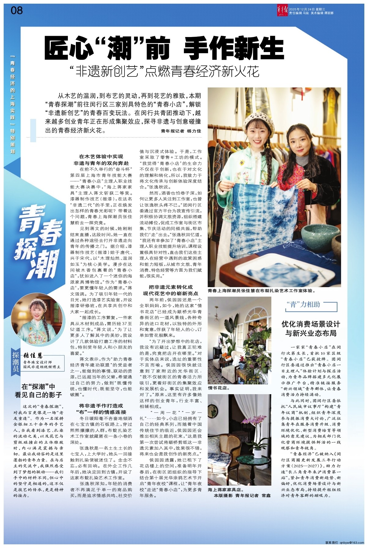 从木艺的温润,到布艺的灵动,再到花艺的雅致,本期“青春探潮”前往闵行区三家别具特色的“青春小店”,解锁“非遗新创艺”的青春百变玩法。在闵行共青团推动下,越来越多创业青年正在形成集聚效应,探寻非遗与创意碰撞出的青春经济新火花。