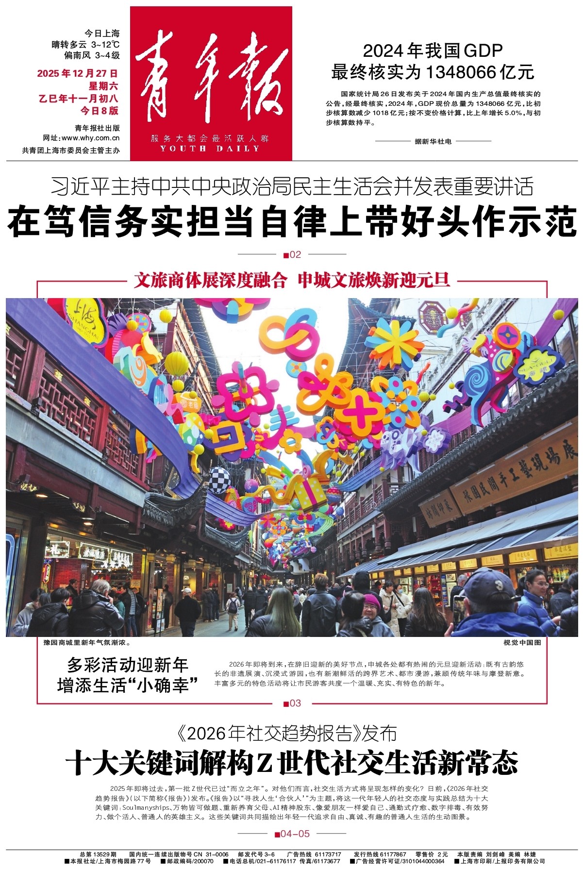 2025年即将过去,第一批Z世代已过“而立之年”。对他们而言,社交生活方式将呈现怎样的变化?日前,《2026年社交趋势报告》(以下简称《报告》)发布。《报告》以“寻找人生‘合伙人’”为主题,将这一代年轻人的社交态度与实践总结为十大关键词:Soulmanyships、万物皆可做题、重新养育父母、AI精神股东、像爱朋友一样爱自己、通勤式疗愈、数字排毒、有效努力、做个活人、普通人的英雄主义。这些关键词共同描绘出年轻一代追求自由、真诚、有趣的普通人生活的生动图景。