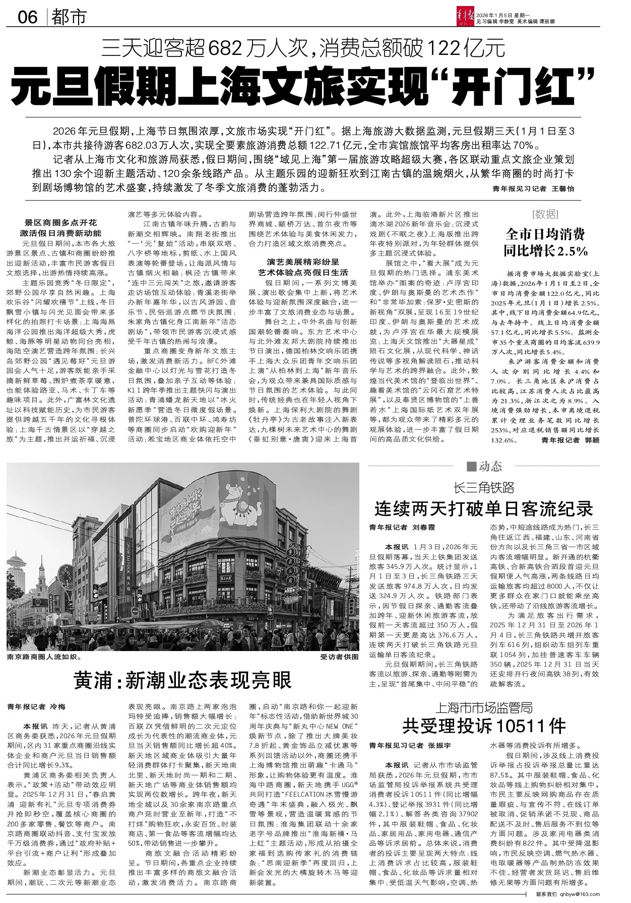 来沪游客消费金额和消费人次分别同比增长4.4%和7.0%。长三角地区来沪消费占比较高,江苏消费人次占比最高为21.3%,浙江次之为8.9%。入境消费强劲增长,本市离境退税累计受理业务笔数同比增长253%,对应退税销售额同比增长132.6%。青年报记者 郭颖