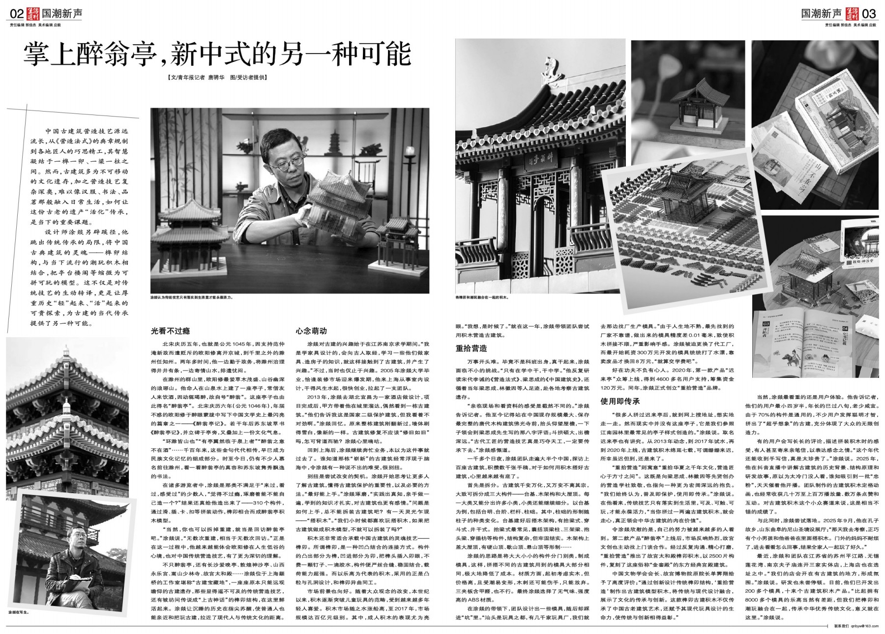 不只醉翁亭,还有长沙爱晚亭、敦煌神沙亭、山西永乐宫、嵩山少林寺、故宫太和殿……涂燚位于上海颛桥的工作室堪称“古建宝藏地”,一座座原本只能远观瞻仰的古建遗存,那些显得遥不可及的传统营造技艺,还有被坊间传说成“上古神话”的榫卯结构,在这里鲜活起来。涂燚让沉睡的历史在指尖苏醒,使普通人也能亲近和把玩古建,拉近了现代人与传统文化的距离。