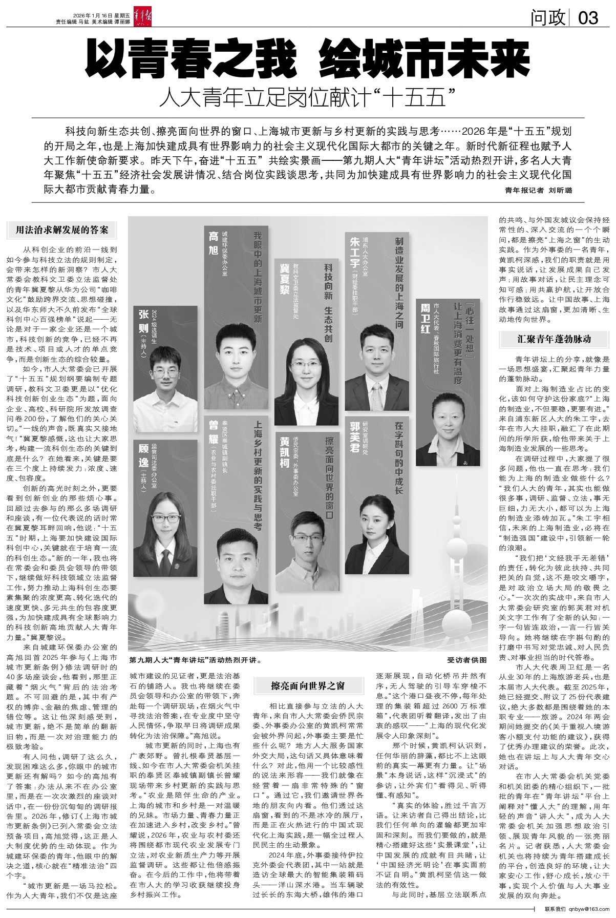 科技向新生态共创、擦亮面向世界的窗口、上海城市更新与乡村更新的实践与思考……2026年是“十五五”规划的开局之年,也是上海加快建成具有世界影响力的社会主义现代化国际大都市的关键之年。新时代新征程也赋予人大工作新使命新要求。昨天下午,奋进“十五五” 共绘实景画——第九期人大“青年讲坛”活动热烈开讲,多名人大青年聚焦“十五五”经济社会发展讲情况、结合岗位实践谈思考,共同为加快建成具有世界影响力的社会主义现代化国际大都市贡献青春力量。