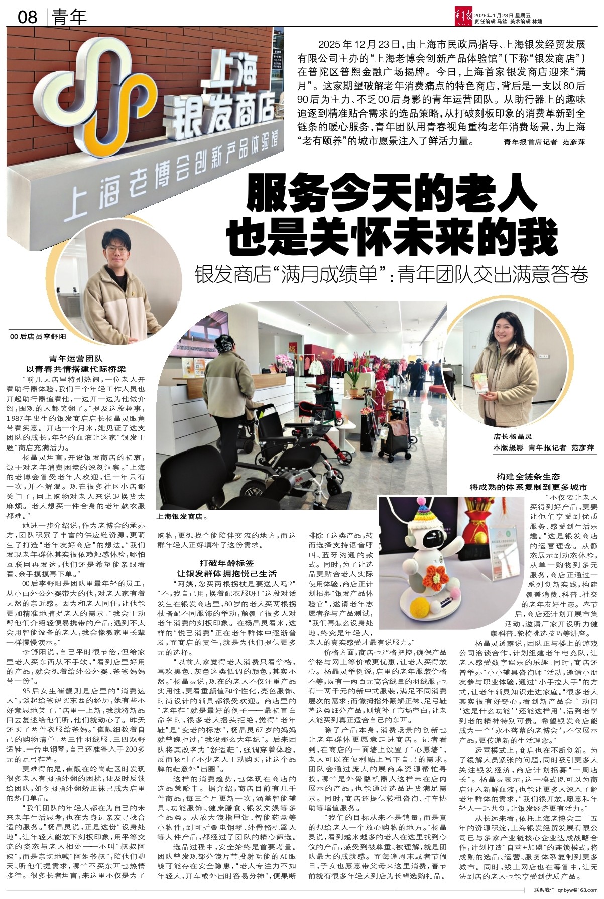 2025年12月23日,由上海市民政局指导、上海银发经贸发展有限公司主办的“上海老博会创新产品体验馆”(下称“银发商店”)在普陀区普熙金融广场揭牌。今日,上海首家银发商店迎来“满月”。这家期望破解老年消费痛点的特色商店,背后是一支以80后90后为主力、不乏00后身影的青年运营团队。从助行器上的趣味追逐到精准贴合需求的选品策略,从打破刻板印象的消费革新到全链条的暖心服务,青年团队用青春视角重构老年消费场景,为上海“老有颐养”的城市愿景注入了鲜活力量。
