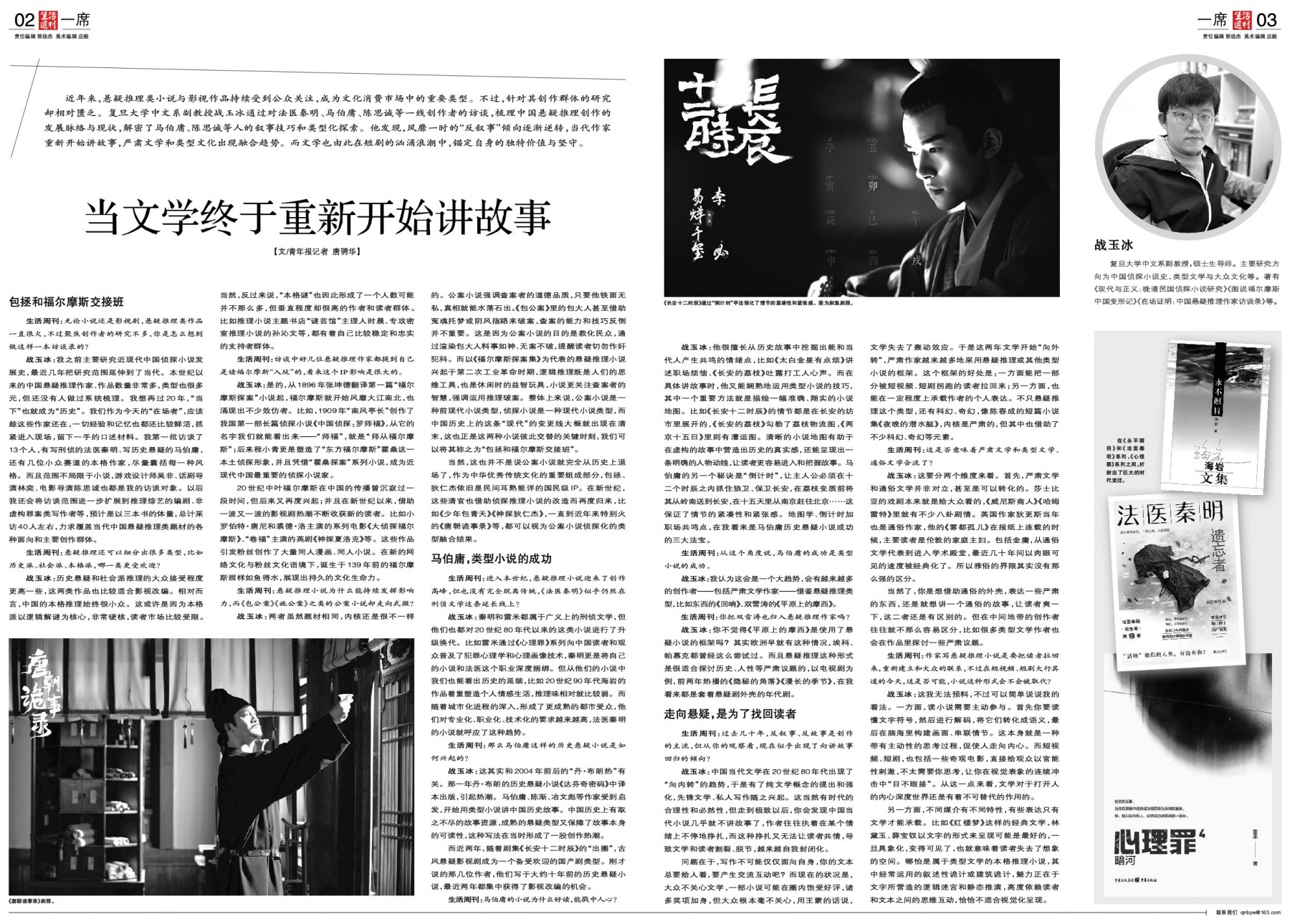 战玉冰:我之前主要研究近现代中国侦探小说发展史,最近几年把研究范围延伸到了当代。本世纪以来的中国悬疑推理作家、作品数量非常多,类型也很多元,但还没有人做过系统梳理。我想再过20年,“当下”也就成为“历史”。我们作为今天的“在场者”,应该趁这些作家还在,一切经验和记忆也都还比较鲜活,抓紧进入现场,留下一手的口述材料。我第一批访谈了13个人,有写刑侦的法医秦明、写历史悬疑的马伯庸,还有几位小众赛道的本格作家,尽量囊括每一种风格。而且范围不局限于小说,游戏设计师吴非、话剧导演林奕、电影导演陈思诚也都是我的访谈对象。以后我还会将访谈范围进一步扩展到推理综艺的编剧、非虚构罪案类写作者等,预计是以三本书的体量,总计采访40人左右,力求覆盖当代中国悬疑推理类题材的各种面向和主要创作群体。