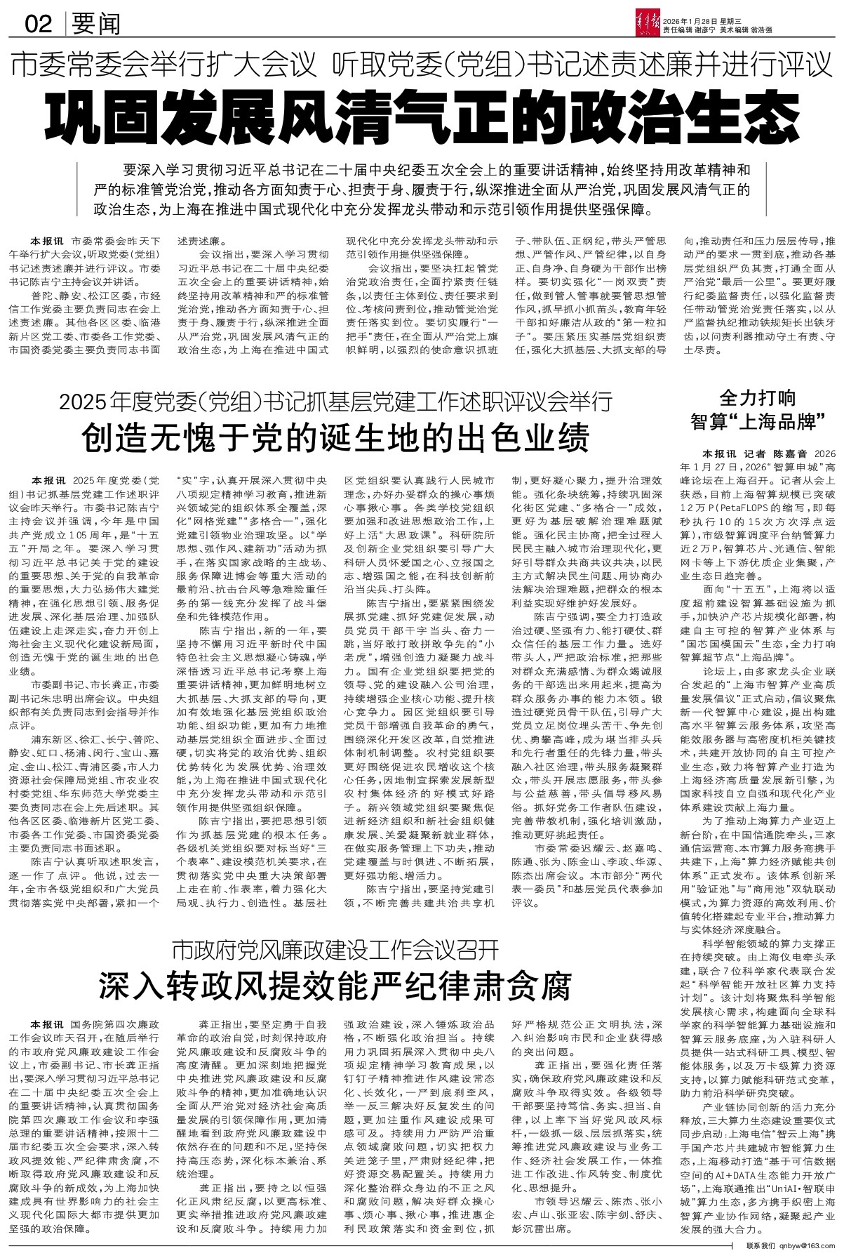 会议指出,要深入学习贯彻习近平总书记在二十届中央纪委五次全会上的重要讲话精神,始终坚持用改革精神和严的标准管党治党,推动各方面知责于心、担责于身、履责于行,纵深推进全面从严治党,巩固发展风清气正的政治生态,为上海在推进中国式现代化中充分发挥龙头带动和示范引领作用提供坚强保障。
