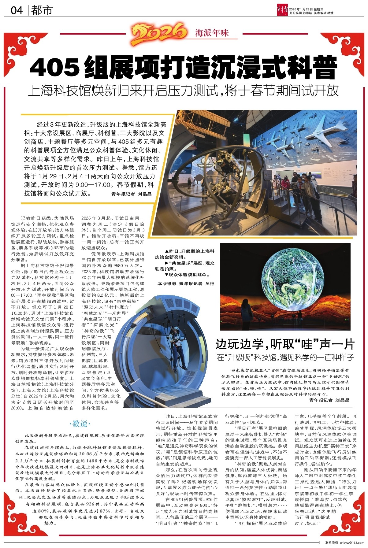 昨日,上海科技馆正式宣布回归时间——马年春节期间将试行开放。馆长倪闽景表示,期待重新开放的科技馆里能响起孩子们的三种声音:“哇”是遇见神奇科学现象的惊叹,“喔”是领悟科学原理的恍然,“咦”则是思考被点燃、疑问自然生发的起点。