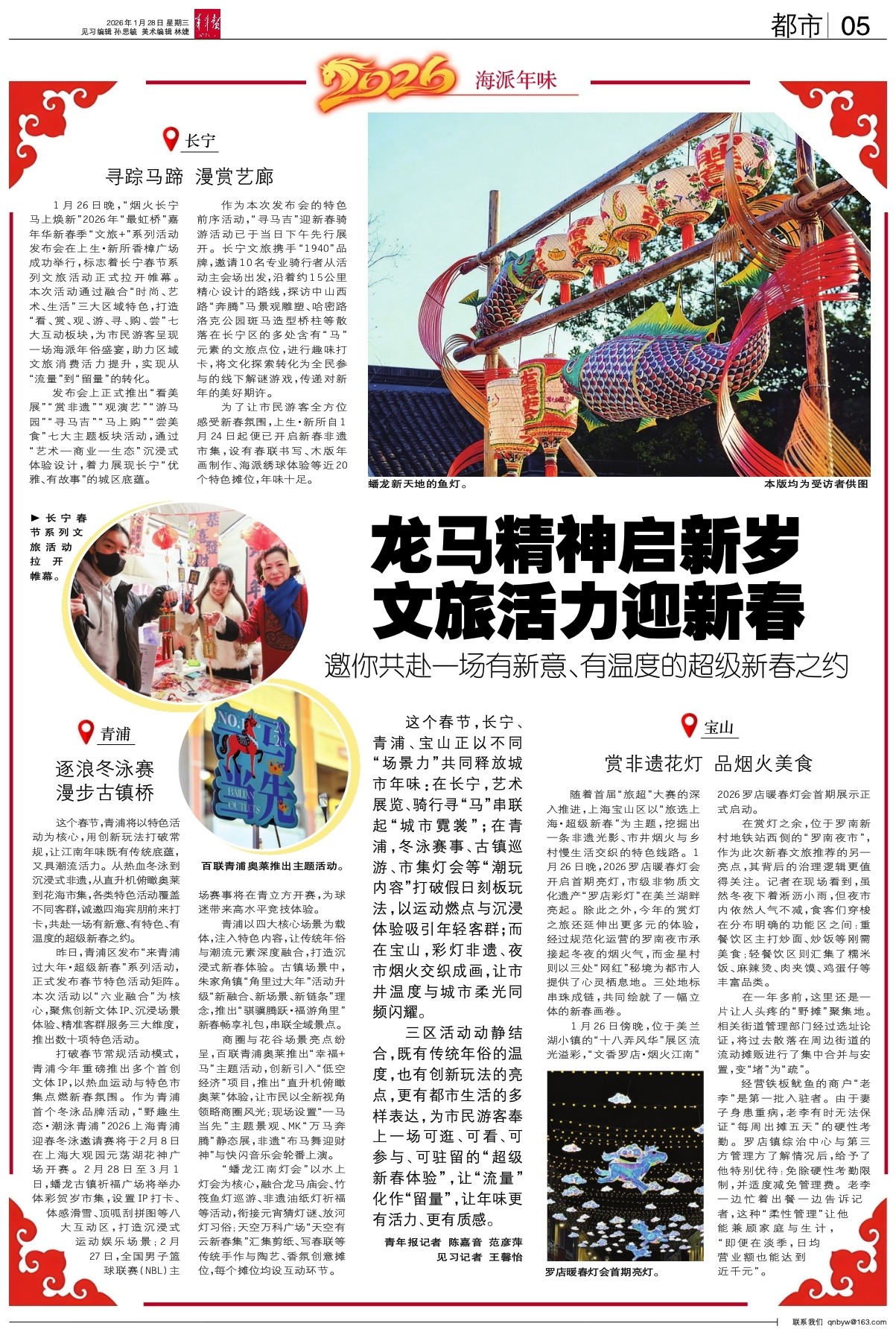 这个春节,长宁、青浦、宝山正以不同“场景力”共同释放城市年味:在长宁,艺术展览、骑行寻“马”串联起“城市霓裳”;在青浦,冬泳赛事、古镇巡游、市集灯会等“潮玩内容”打破假日刻板玩法,以运动燃点与沉浸体验吸引年轻客群;而在宝山,彩灯非遗、夜市烟火交织成画,让市井温度与城市柔光同频闪耀。