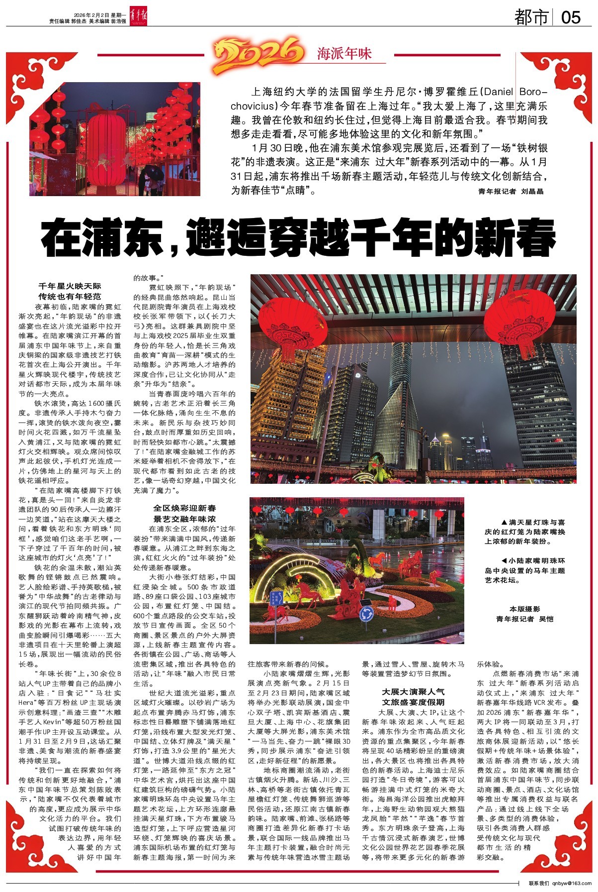 上海纽约大学的法国留学生丹尼尔·博罗霍维丘(Daniel Boro-chovicius)今年春节准备留在上海过年。“我太爱上海了,这里充满乐趣。我曾在伦敦和纽约长住过,但觉得上海目前最适合我。春节期间我想多走走看看,尽可能多地体验这里的文化和新年氛围。”