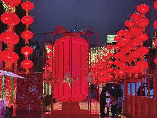 满天星灯珠与喜庆的红灯笼为陆家嘴换上浓郁的新年装扮。