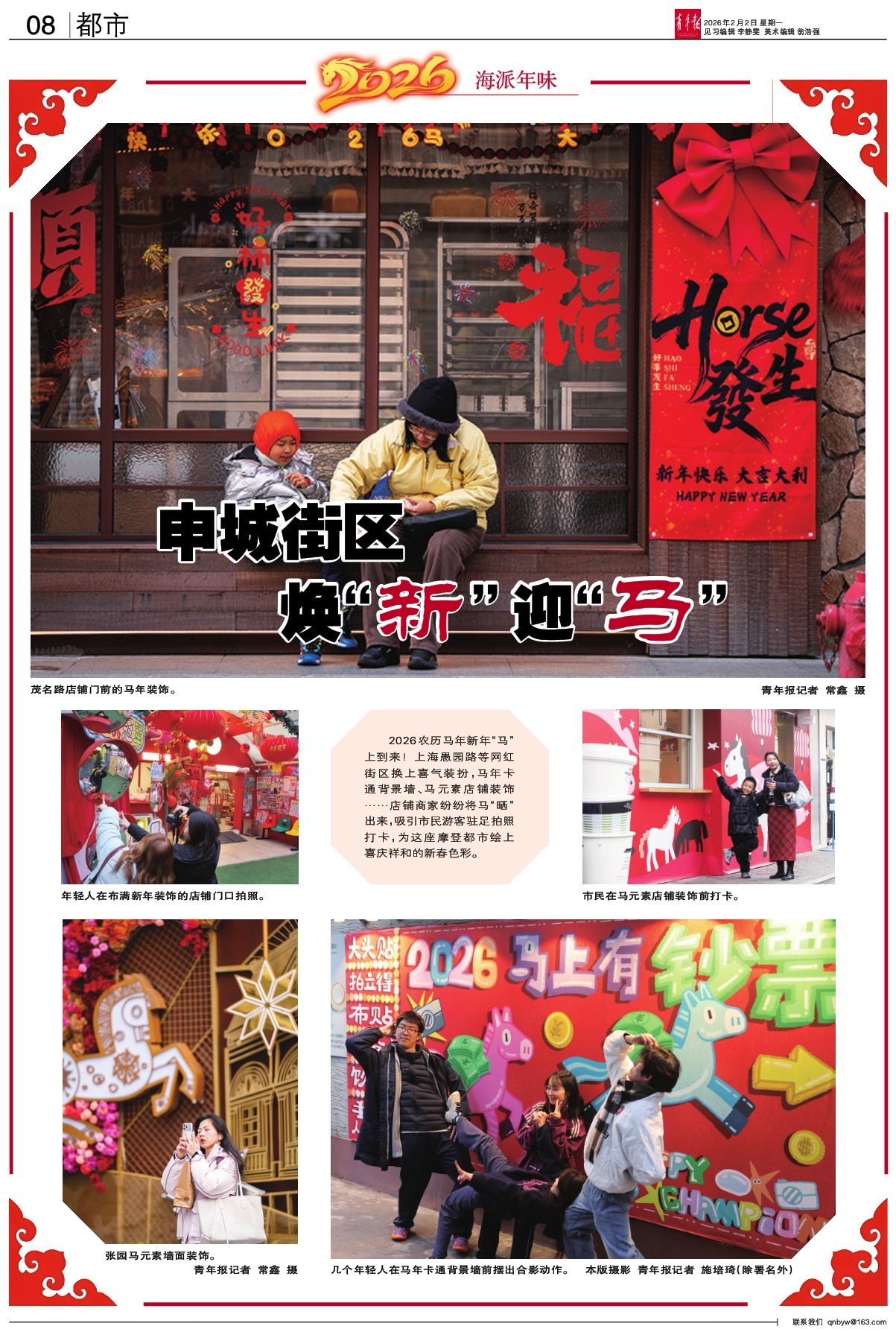 2026农历马年新年“马”上到来! 上海愚园路等网红街区换上喜气装扮,马年卡通背景墙、马元素店铺装饰……店铺商家纷纷将马“晒”出来,吸引市民游客驻足拍照打卡,为这座摩登都市绘上喜庆祥和的新春色彩。