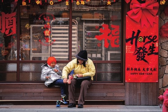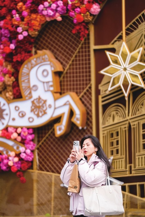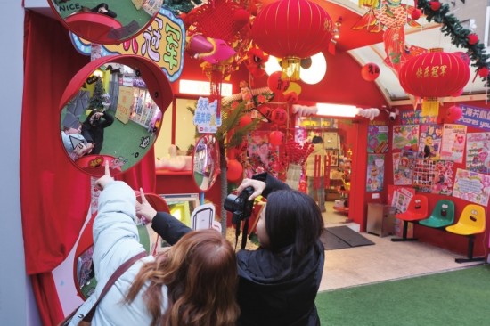 年轻人在布满新年装饰的店铺门口拍照。