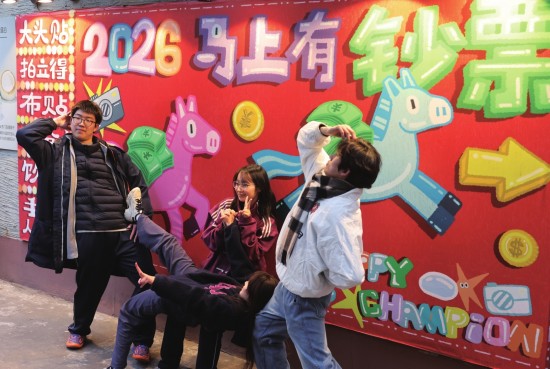 几个年轻人在马年卡通背景墙前摆出合影动作。本版摄影 青年报记者 施培琦(除署名外)