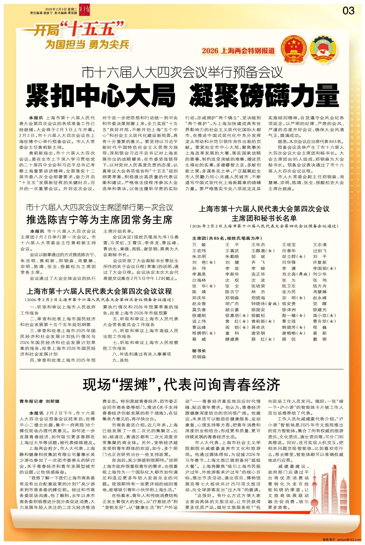 黄莉新指出,市十六届人大四次会议,是在全市上下深入学习贯彻党的二十届四中全会和习近平总书记考察上海重要讲话精神,全面落实十二届市委八次全会部署要求,奋力开启“十五五”发展新征程的关键时点,召开的一次重要会议。开好这次会议,对于进一步把思想和行动统一到中央和市委决策部署上来,全力实现“十五五”良好开局,不断开创上海“五个中心”和社会主义现代化建设新局面,具有十分重要的意义。要坚持以习近平新时代中国特色社会主义思想为指导,深刻领会习近平总书记对上海发展作出的战略擘画,在市委坚强领导下,以对党对人民高度负责的态度,认真审议大会各项报告和“十五五”规划纲要草案,积极提出高质量的代表议案和建议,严格依法按程序参加大会选举和表决,以依法履职尽责的实际行动,忠诚拥护“两个确立”、坚决做到“两个维护”,为上海加快建成具有世界影响力的社会主义现代化国际大都市、在推进中国式现代化中充分发挥龙头带动和示范引领作用作出新的贡献。要紧扣全市中心大局,聚焦事关上海改革发展的大事、落实国家战略的要事、制约攻坚突破的难事、增进民生福祉的实事,多建睿智之言,多献创新之策,多谋务实之举,广泛凝聚起全市人民勠力同心共建人民城市、不断谱写中国式现代化上海新篇章的磅礴力量。要严格落实中央八项规定及其实施细则精神,自觉遵守会风会纪各项规定,以严明的纪律、严肃的会风、严谨的态度开好会议,确保大会风清气正、圆满成功。