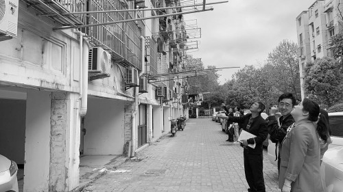 王敏(右一)查看架空层改造现场情况。 受访者供图