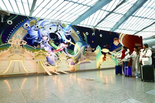 护栏玻璃上贴着精美的二次元风格窗花,立柱灯箱印有灵动飘逸的游戏角色,巨幅的主题墙绘前聚满了拍照留念的年轻人……传统春运的归家场景,与数字世界的奇幻想象在此刻交织,碰撞出别样的年味与新意。