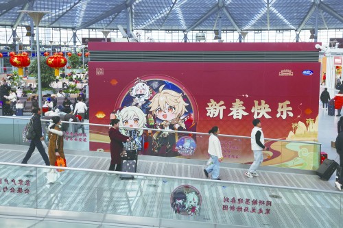 护栏玻璃上贴着精美的二次元风格窗花,立柱灯箱印有灵动飘逸的游戏角色,巨幅的主题墙绘前聚满了拍照留念的年轻人……传统春运的归家场景,与数字世界的奇幻想象在此刻交织,碰撞出别样的年味与新意。