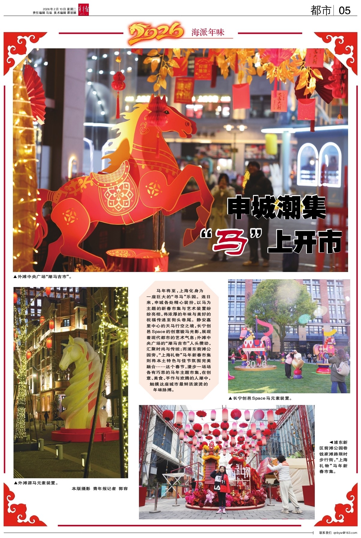 马年将至,上海化身为一座巨大的“寻马”乐园。连日来,申城各处精心装扮,以马为主题的新春市集与艺术装置纷纷亮相,将浓厚的年味与美好的祝福传递至街头巷尾。静安嘉里中心的天马行空之境,长宁创邑Space的创意骏马光影,展现着现代都市的艺术气息;外滩中央广场的“潮马吉市”人头攒动,汇聚时尚与传统;而浦东前滩公园旁,“上海礼物”马年新春市集则将本土特色与佳节氛围完美融合……这个春节,漫步一场场各有巧思的马年主题市集,在创意、美食、手作与欢腾的人潮中,触摸这座城市最鲜活滚烫的年味脉搏。