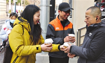 志愿者为新就业群体送上咖啡。青年报记者 郭容 摄