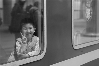 在北京西站,一名跟随家人乘坐K4069次列车的小朋友面对镜头露出笑脸。