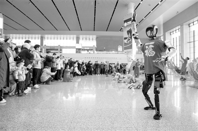 乘客在合肥南站观看机器人拜年表演。