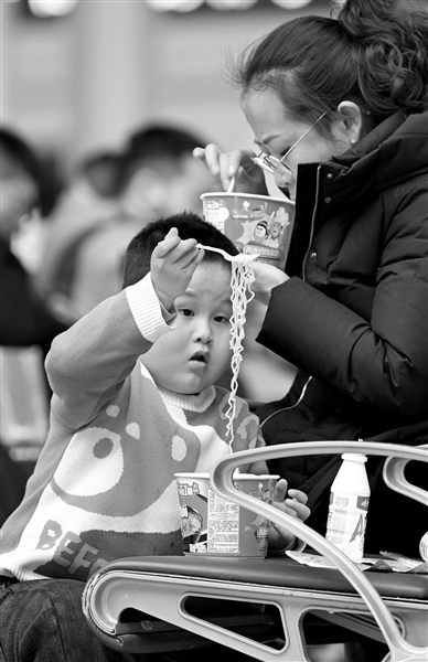 一名小朋友在郑州东站候车时吃泡面。