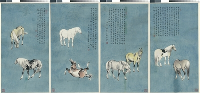 “古道西风瘦马”自然是一种风格,但大多数画家只要画到马,便似乎多了几分深情,“寄情于马”,要通过画马来体现一种精神。在众多馆藏马图中,最引起记者关注的还是绘画名家戈湘岚的一套四联《马》。上海美术馆典藏部副主任邱旻彧告诉记者,戈湘岚画马与徐悲鸿齐名,郭沫若曾以“今之曹霸,名贵一时”品评,时人称“北徐南戈”。