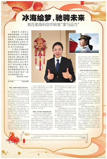 从“雪龙”号驾驶台到航海科研前沿,从极地冰原到科普讲台,白响恩以实践为笔、创新为墨,在蔚蓝海洋与家国情怀间书写航海人的担当,也让“家与远方”成为校准生活意义的精神坐标。新的一年,她也期望着更多年轻人成为自己命运的“船长”,驶向辽阔的星辰大海。