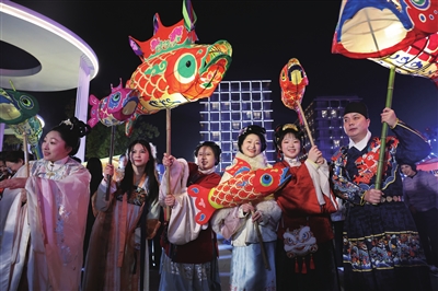 2月28日晚,在图灵广场,年轻人相约滴水湖元宵奇妙夜。青年报记者 吴恺 摄