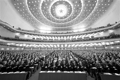 人民大会堂万人大礼堂气氛庄重热烈,主席台帷幕正中的国徽在鲜艳的红旗映衬下熠熠生辉。
