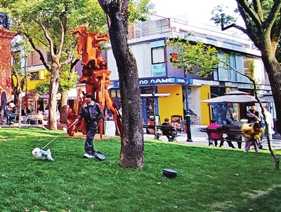年轻人在宠物友好街区遛狗。青年报记者 郭颖 摄
