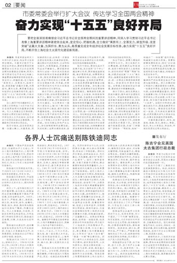 会上,陈吉宁和市委副书记、市长龚正分别传达了习近平总书记在全国两会期间的重要讲话精神。市人大常委会主任黄莉新、市政协主席胡文容分别传达了十四届全国人大四次会议、全国政协十四届四次会议主要精神。市委副书记朱忠明出席会议。