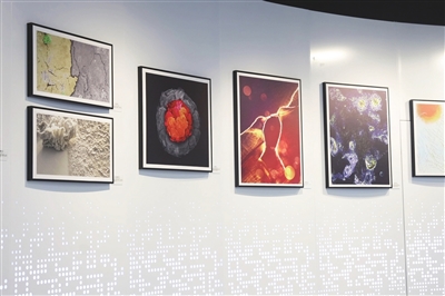 在复旦科技成果馆里,有一面极具视觉冲击力的科学油画墙。在这里高倍电子显微镜下的纳米晶格化作星云画卷,细胞膜的褶皱被赋予岩层的史诗感,“科艺融合”一词被具象阐释。