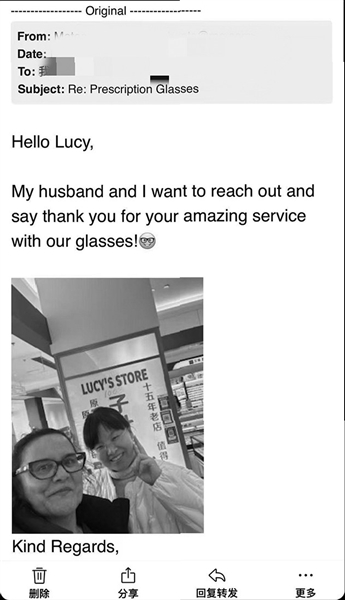 “子叶眼镜”的店主童庆英今年四十二岁,在上海国际眼镜城已经扎根了二十年。有些熟客还记得,她最早的铺面开在三楼。为了方便打交道,她给自己起了个英文名“Lucy”,印在双语名片上。如今,靠着口口相传,店里外国顾客的销售额占比已悄然攀升至四成左右。她的手机相册里,存着几百张外国客人的合照。有些是在店门口戴着眼镜的留影,有些则是客人回国后从大洋彼岸发来的返图。