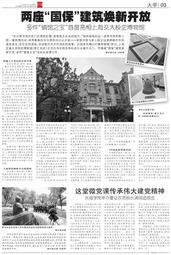依托这两座“国保”建筑,上海交大校史博物馆(徐汇校区)以“建筑可阅读、历史可触摸、精神可传承”的理念,将静态的历史建筑转化为动态的育人场域,让百年校园真正成为可走进、可感知、可对话的精神家园。