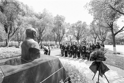 参加活动的全体人员在夏征农老校长铜像前肃立默哀。 受访者供图