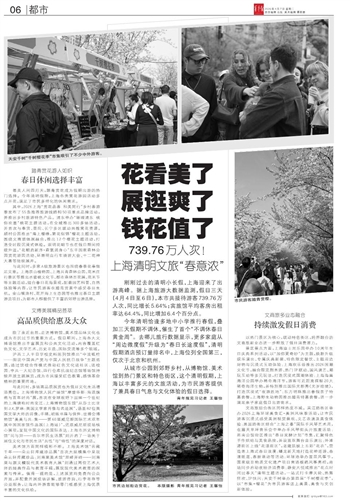 刚刚过去的清明小长假,上海迎来了出游高峰。据上海旅游大数据监测,假日三天(4月4日至6日),本市共接待游客739.76万人次,同比增长5.64%;宾旅馆平均客房出租率达64.4%,同比增加6.4个百分点。