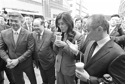 郑丽文在美团上海总部体验无人机送外卖时品尝奶茶。新华社 图
