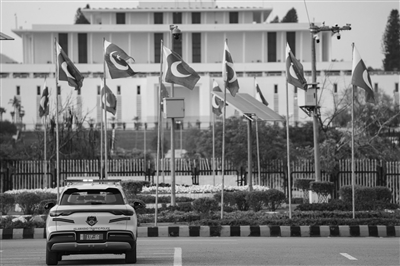 4月16日在伊斯兰堡总统府前拍摄的警车。 新华社 图