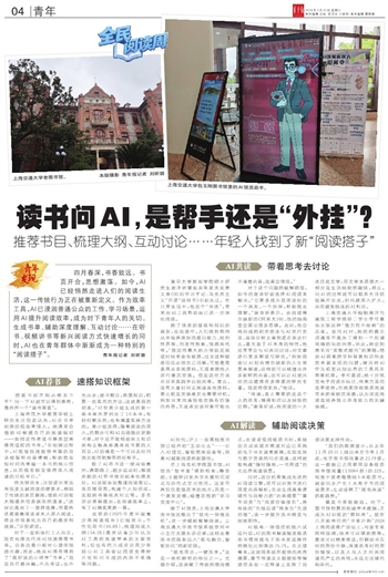 四月春深,书香致远。书页开合,思想激荡。如今,AI已经悄然走进人们的阅读生活,这一传统行为正在被重新定义。作为效率工具,AI已浸润普通公众的工作、学习场景,运用AI提升阅读效率,成为时下青年人的关切。生成书单、辅助深度理解、互动讨论……在听书、视频讲书等新兴阅读方式快速增长的同时,AI也在青年群体中渐渐成为一种特别的“阅读搭子”。 青年报记者 刘昕璐