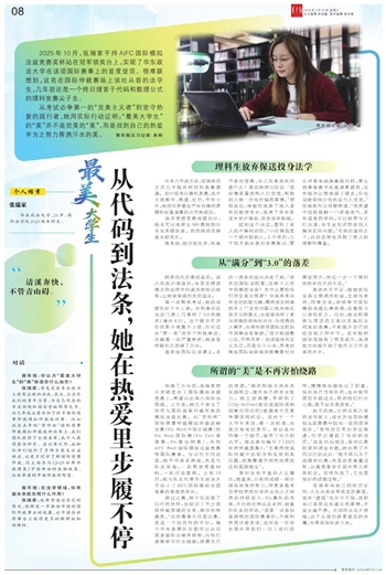 如今的她,已然从刚入学的法学新人,成长为在国际模拟法庭赛事中独当一面的资深领队。“虽然自己有时还会焦虑,但早已摆脱了当初的迷茫。”这名05后坦言,面对比赛结果和课业分数,她也有了不同以往的认识:“我不再只为了成绩而比赛,而是会更看重过程,认真准备并在其中努力抓取机会。即便失败了,它也是很好的试错过程。”