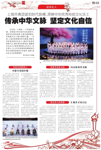 文化是一个国家、一个民族的灵魂。在推进中国式现代化的进程中,唯有文化自信自强,才能为强国建设、民族复兴注入强大精神力量。一年来,上海共青团紧扣时代脉搏,深耕中华优秀传统文化沃土,通过打造系列网络产品、推出系列品牌活动、凝聚青年文化人才等多项举措,以文化人、以文育人,让中华文明独特的精神标识和文化基因涵养青少年爱党、爱国、爱社会主义的深厚情怀。