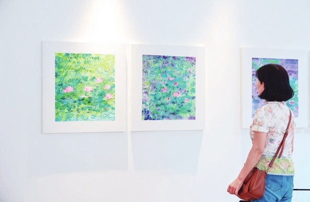 以江南夏日的标志性植物“荷”的清雅淡泊来呼应夏日的清爽,是此次展览的初衷。作为沪上知名艺术家,宋巍担任上海市美术家协会理事、上海市徐汇区文联副主席、上海市青年美术摄影家协会副主席及上海师范大学美术教育系副主任,代表作有《苏醒中的女孩》《苏醒中的男子》《曲水流觞系列——水彩芭蕾》等。本次在张园展出的作品,是宋巍在7年中近21个月的花期时间里,观察日出日落时荷花的变化所绘制出的。画作通过荷花与梅兰竹菊、山石奇木的组合,展示出丰富多样的视角,本身具有极高的艺术价值。值得一提的是,这些画作的布置结合现场空间,因地制宜,形成多个灵动的主题展区,仿佛于城市中打造出一亩荷塘美景,吸引了众多市民“为荷而来”。
