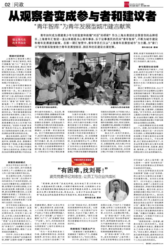 - 从观察者变成参与者和建议者 青年如何成为搭建青少年与实验室和街镇“对话”的桥梁?作为上海共青团在全国首创的品牌项目,上海青年汇智团一直以来都是关心青年事务、乐于议事惠民的民间“青年智库”,不断为城市建设和青年发展建言献