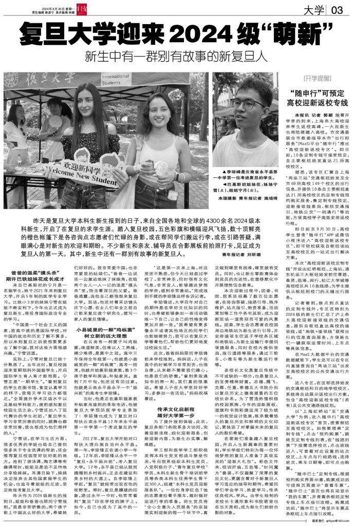 - 复旦大学迎来2024级“萌新” 昨天是复旦大学本科生新生报到的日子,来自全国各地和全球的4300余名2024级本科新生,开启了在复旦的求学生涯。踏入复旦校园,五色彩旗和横幅迎风飞扬,数十顶鲜亮的橙色帐篷下是各咨询点志愿者们
