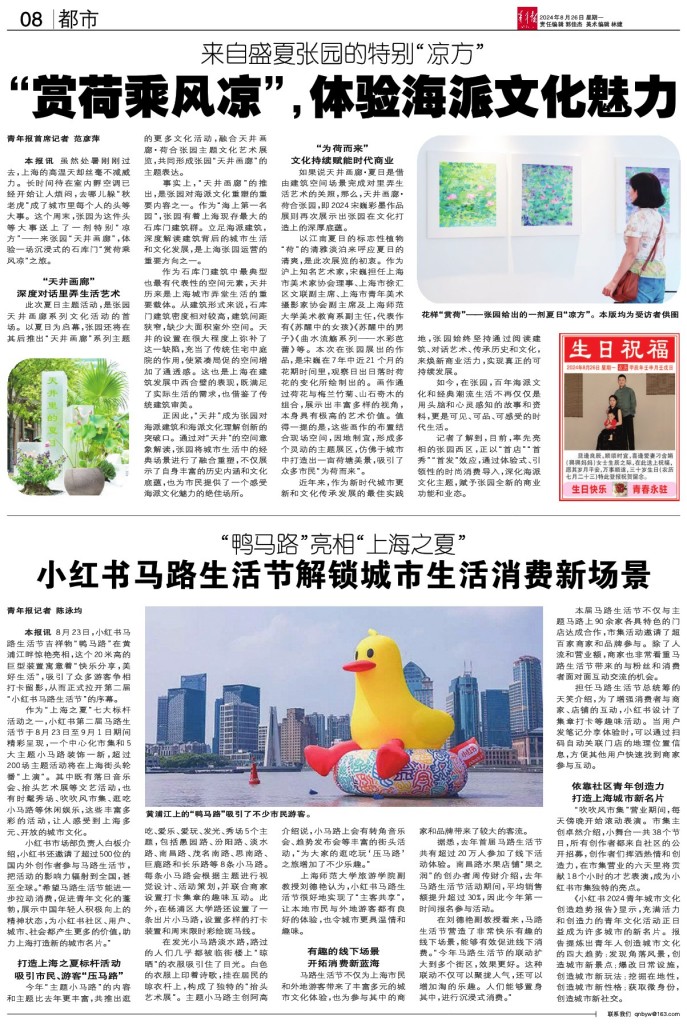 - 小红书马路生活节解锁城市生活消费新场景 青年报记者 陈泳均 本报讯8月23日,小红书马路生活节吉祥物“鸭马路”在黄浦江畔惊艳亮相,这个20米高的巨型装置寓意着“快乐分享,美好生活”,吸引了众多游客争相打卡留影,从而正式拉