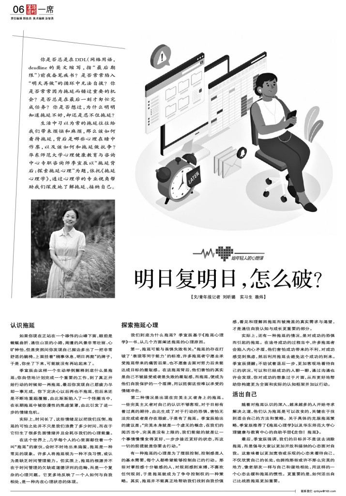 【文/青年报记者 刘昕璐 实习生 赖炜】 你是否总是在DDL(网络用语,deadline的英文缩写,指“最后期限”)前夜奋笔疾书?是否常常陷入“明天再做”的循环中无法自拔?你是否常