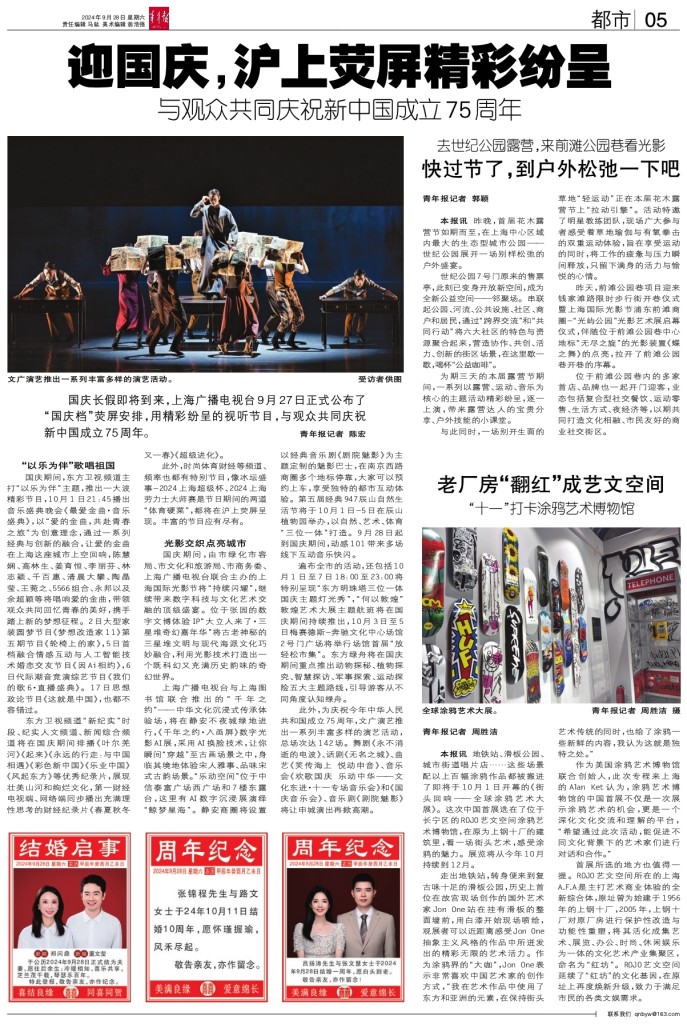 - 迎国庆,沪上荧屏精彩纷呈 国庆长假即将到来,上海广播电视台9月27日正式公布了“国庆档”荧屏安排,用精彩纷呈的视听节目,与观众共同庆祝新中国成立75周年。 青年报记者 陈宏 “以乐为伴”歌唱祖国