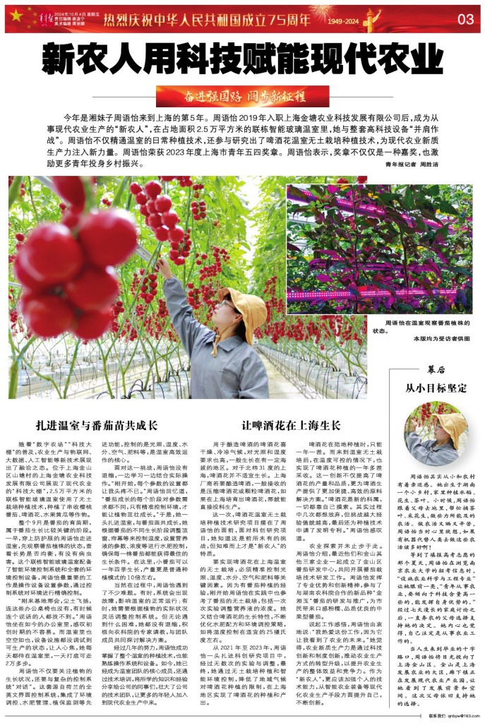 今年是湘妹子周语怡来到上海的第5年。周语怡2019年入职上海金塘农业科技发展有限公司后,成为从事现代农业生产的“新农人”,在占地面积2.5万平方米的联栋智能玻璃温室里,她与整套高科技设备“并肩作战”。周语怡不仅精通温室的日常种植技术,还参与研究出了啤酒花温室无土栽培种植技术,为现代农业新质生产力注入新力量。周语怡荣获2023年度上海市青年五四奖章。周语怡表示,奖章不仅仅是一种嘉奖,也激励更多青年投身乡村振兴。