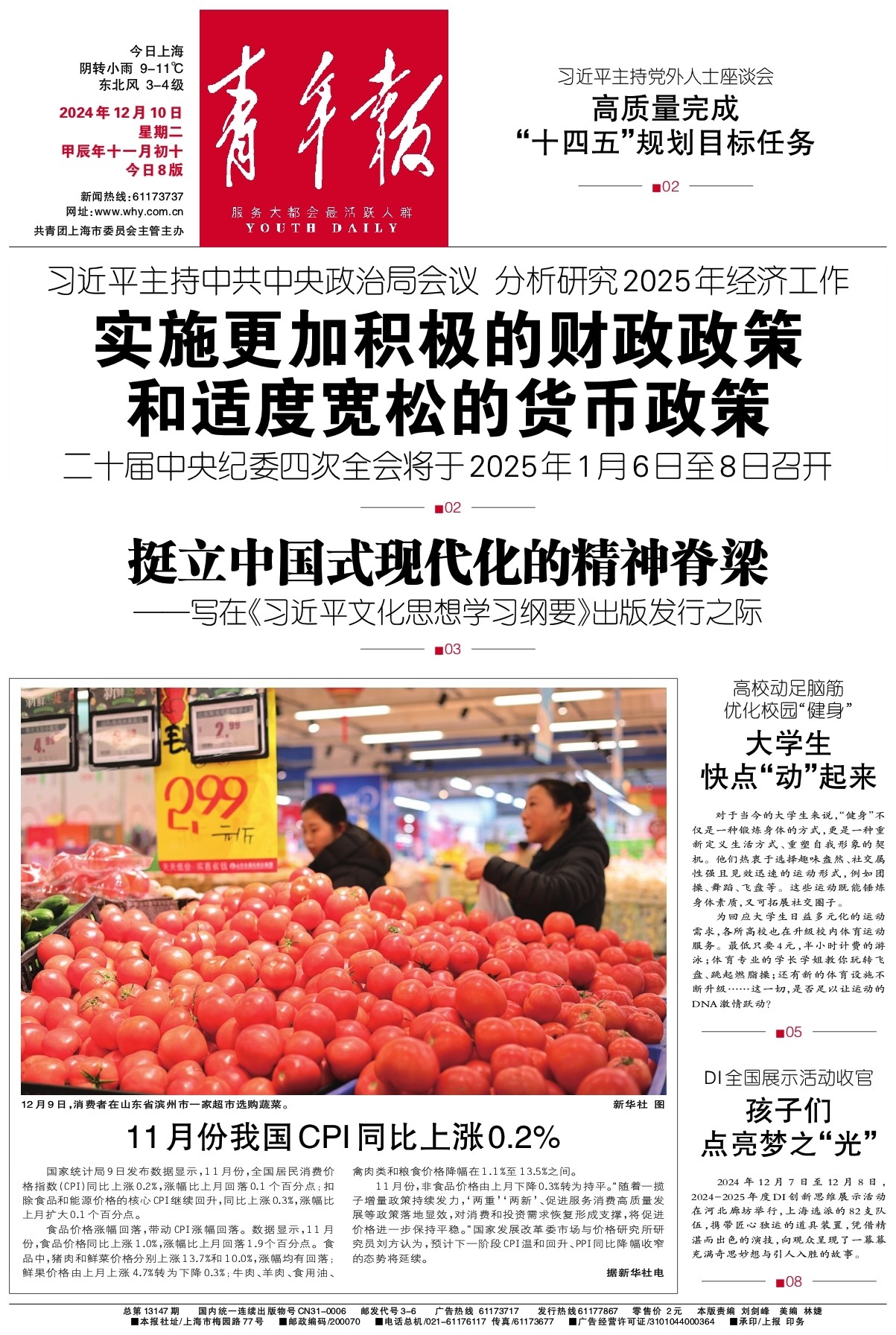 会议指出,明年要坚持稳中求进、以进促稳,守正创新、先立后破,系统集成、协同配合,实施更加积极的财政政策和适度宽松的货币政策,充实完善政策工具箱,加强超常规逆周期调节,打好政策“组合拳”,提高宏观调控的前瞻性、针对性、有效性。要大力提振消费、提高投资效益,全方位扩大国内需求。要以科技创新引领新质生产力发展,建设现代化产业体系。要发挥经济体制改革牵引作用,推动标志性改革举措落地见效。要扩大高水平对外开放,稳外贸、稳外资。要有效防范化解重点领域风险,牢牢守住不发生系统性风险底线。要持续巩固拓展脱贫攻坚成果,统筹推进新型城镇化和乡村全面振兴,促进城乡融合发展。要加大区域战略实施力度,增强区域发展活力。要协同推进降碳减污扩绿增长,加快经济社会发展全面绿色转型。要加大保障和改善民生力度,增强人民群众获得感幸福感安全感。
