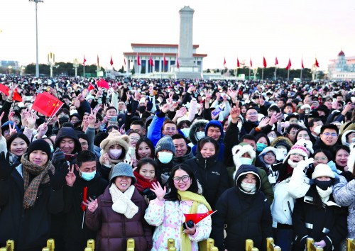 每一个人都是主角 2025年1月1日清晨,北京天安门广场举行隆重的升国旗仪式。这是观众在升旗仪式结束后欢呼。新华社 图