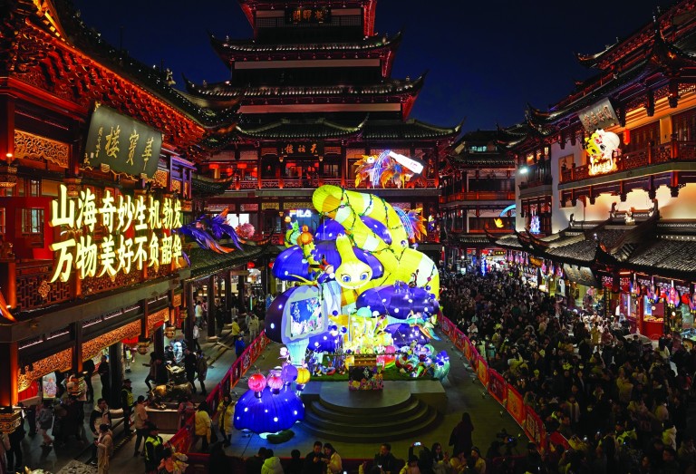 每一束光芒都熠熠生辉 2025年1月1日拍摄的豫园商城中心广场的生肖蛇年主题灯组。新华社 图